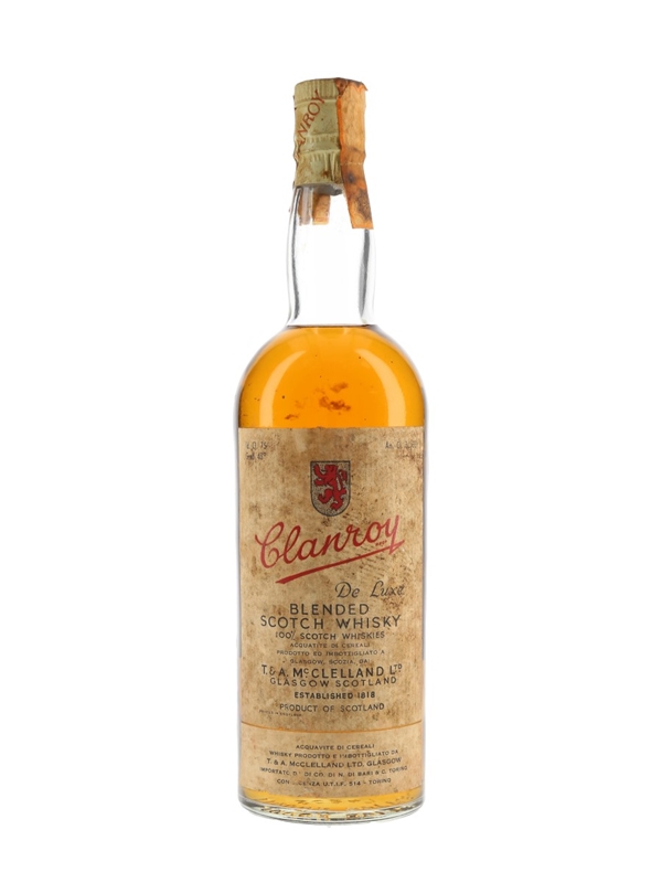 A bottle of Clanroy De Luxe Blended Scotch Whisky, produced by T & A McClelland Ltd. This was bottled for the Italian market, we estimate in the 1970s.
