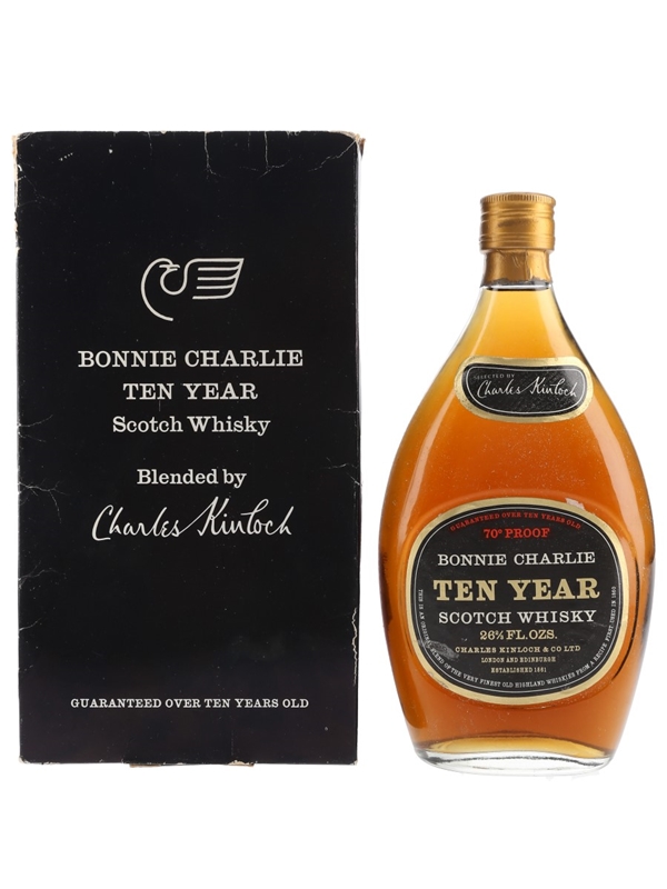 A bottle of Charles Kinloch Bonnie Charlie 10 Year Old Scotch Whisky, an Original Blend of the Very Finest Old Highland Whiskies. We estimate this was bottled in the 1950s to 1960s.