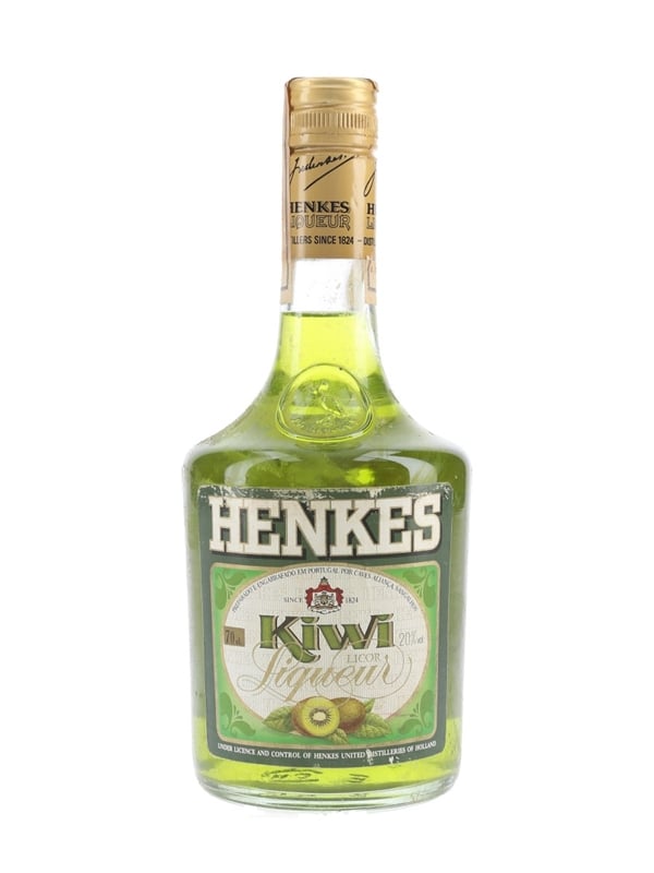A bottle of Henkes Kiwi Liqueur prepared and bottled in Sangalhos, Portugal, by Caves Alianca, under licence and control of Henkes United Distilleries of Holland.