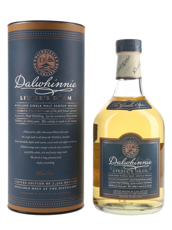 A bottle of Dalwhinnie Lizzie's Dram Highland Single Malt Scotch Whisky. This was bottled in honour of Elizabeth Stewart, one of the first female operators in Scottish Malt Distilling, who worked at Dalwhinnie Distillery for thirty years.