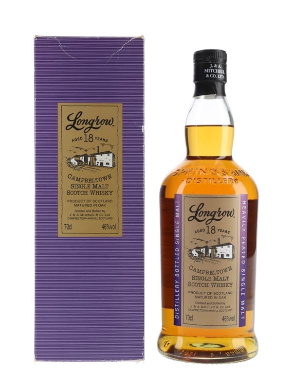A bottle of Longrow 18 Year Old Single Malt Scotch Whisky, distilled at the Springbank distillery. The bottling code indicates this was bottled in 2013.