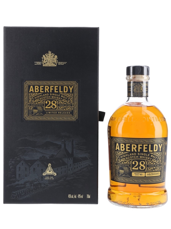 A limited release bottle of Aberfeldy 28 Year Old Single Malt Scotch Whisky.