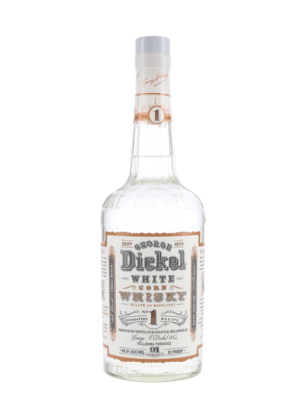 A bottle of George Dickel No.1 White Corn whisky, an unaged spirit based on the distillery's Foundation Recipe. This was distilled and charcoal mellowed at George A Dickel & Co. Tullahoma, Tennessee.