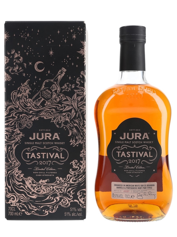A bottle of Jura Tastival 2017 Single Malt Scotch Whisky, matured in American white oak ex-bourbon barrels and Portuguese ruby port pipes.