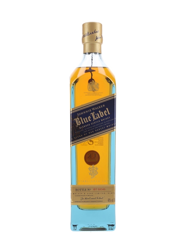 A bottle of Johnnie Walker Blue Label, a super premium blend made from long-aged malt and grain whiskies.