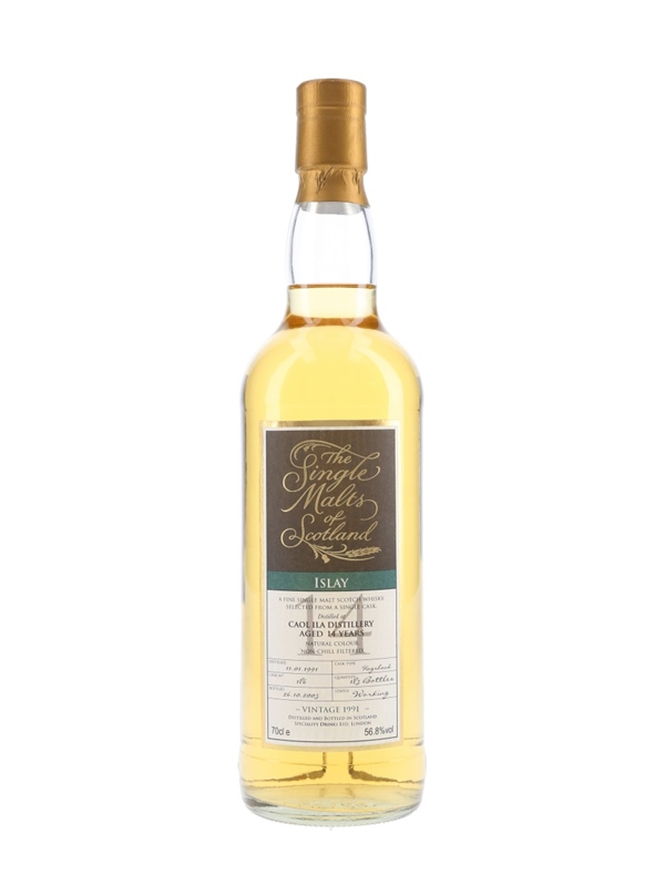 A bottle of Caol Ila 14 Year Old Single Malt Scotch Whisky. This was distilled on 11 January 1991, matured in a single hogshead and bottled by Speciality Drinks Ltd. on 26 October 2005 for The Single Malts of Scotland series.