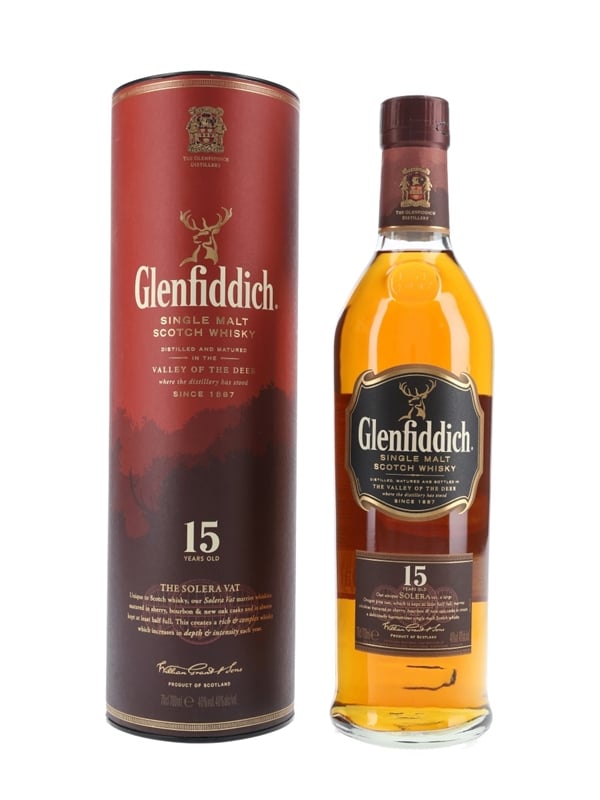 A bottle of Glenfiddich 15 Year Old Single Malt Scotch Whisky. The spirit is matured in three different cask types: bourbon, sherry, and new oak, before marrying in a large hand-made cask called a solera vat.