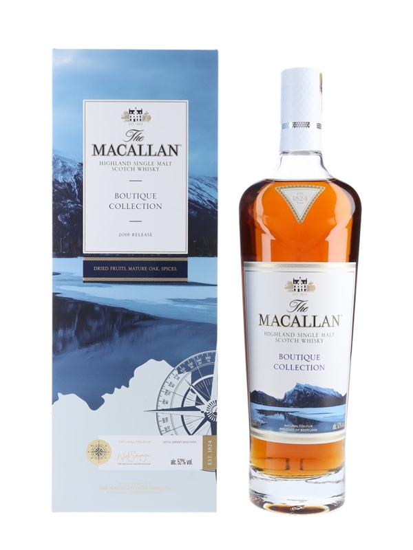 A bottle of The Macallan Boutique Collection Highland Single Malt Scotch Whisky, released in 2019 to mark the launch of The Macallan Boutique programme. Celebrating famous waters of the world, this edition features Canada's Vermilion Lakes and was released exclusively for The Macallan Distillery Boutique and The Macallan Airport Boutiques.