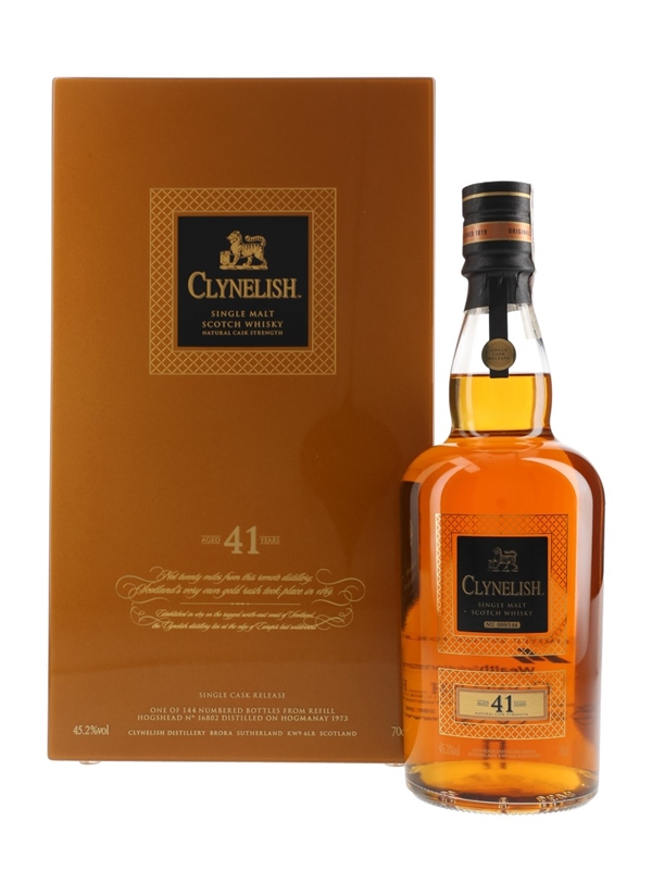 A bottle of Clynelish 1973 41 Year Old Single Malt Scotch Whisky. This comes from a single refill hogshead filled on 31 December 1973, New Year's Eve, which is known as Hogmanay in Scotland. It was matured for 41 years before bottling at natural cask strength in 2015 for Polish company Wealth Solutions.