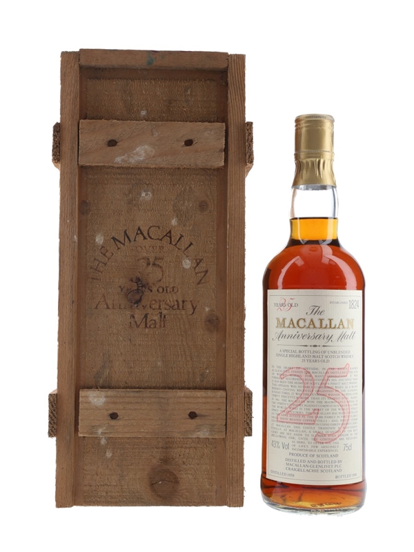 A bottle of The Macallan Unblended Single Highland Malt Scotch Whisky, distilled in 1958 and matured in sherry casks for more than 25 years. This was bottled in 1984 as part of The Macallan's Anniversary Malt series.