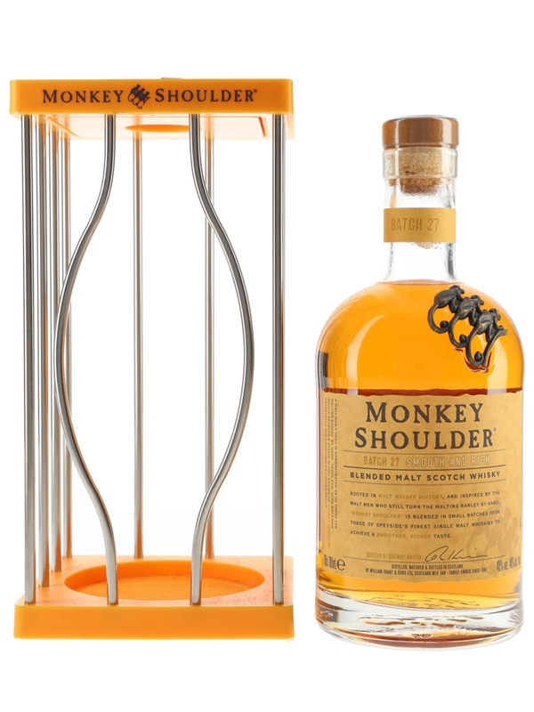 A bottle of Monkey Shoulder Blended Malt Scotch Whisky. This is a blend of malt whiskies from three Speyside distilleries, produced and bottled by William Grant & Sons Ltd. This edition comes in a cage.