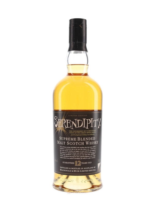 A bottle of Serendipity 12 Year Old Supreme Blended Malt Scotch Whisky. This is a blend of 20% 1992 Glen Moray and 80% much older Ardbeg, bottled by Macdonald & Muir Limited.