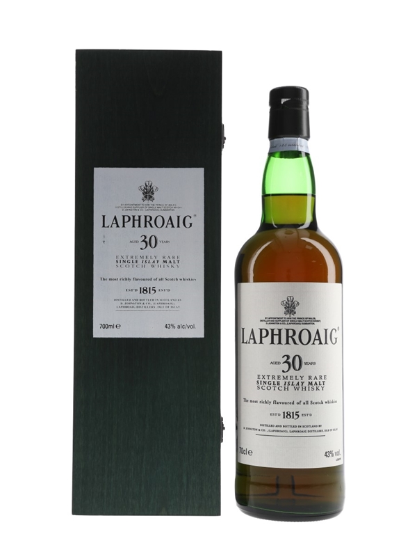 A bottle of Laphroaig 30 Year Old Single Islay Malt Scotch Whisky, bottled at 43% ABV and presented in a wooden case. We estimate this was bottled in the 2000s.
