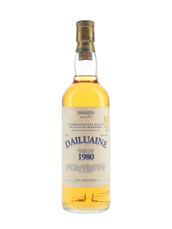 A bottle of Dailuaine 1980 Unblended Malt Scotch Whisky, matured in a single cask and bottled in 1998. This was distributed in Italy by Samaroli.