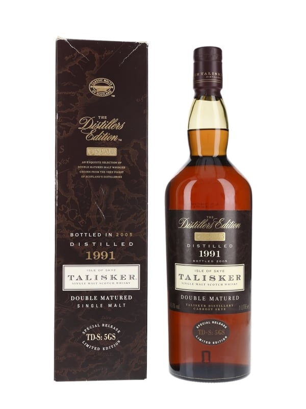 A litre bottle of Talisker 1991 Single Malt Scotch Whisky from the Isle of Skye. This was distilled in 1991, matured in amoroso sherry casks and bottled in 2005 for the Distillers Edition series.