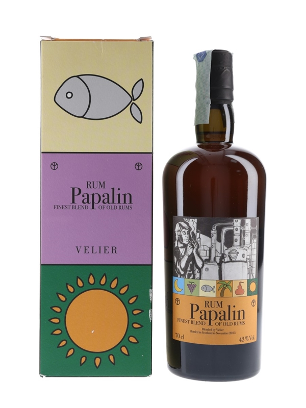 A bottle of Rum Papalin, the first blended rum bottled for Velier. It was blended in 2012 and bottled in November 2013. It was created using Caroni rum from Trinidad, as well as some Cuban and Venezuelan rums.