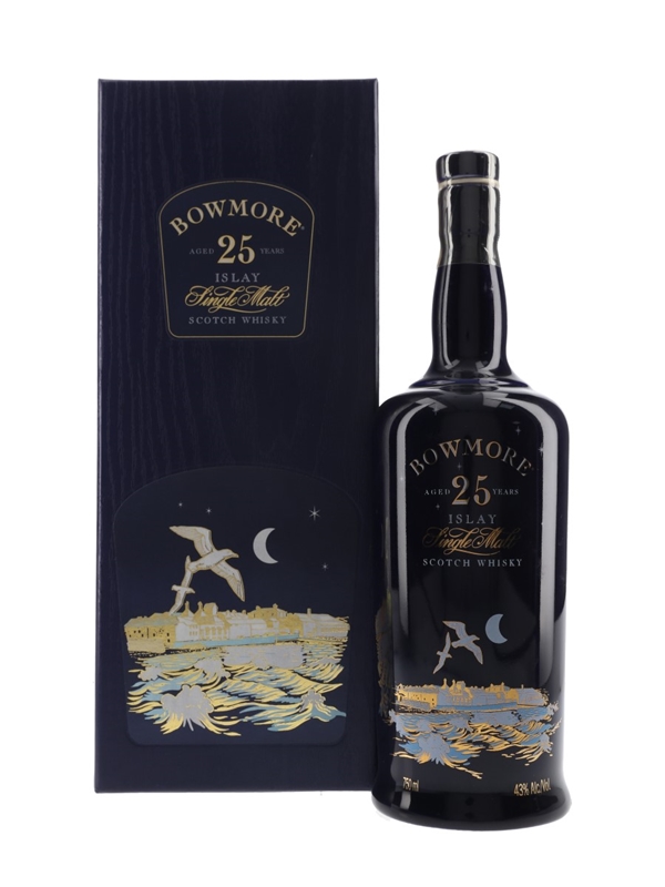 A bottle of Bowmore 25 Year Old Islay Single Malt Scotch Whisky, presented in a blue ceramic decanter. This expression was released in the 1990s.