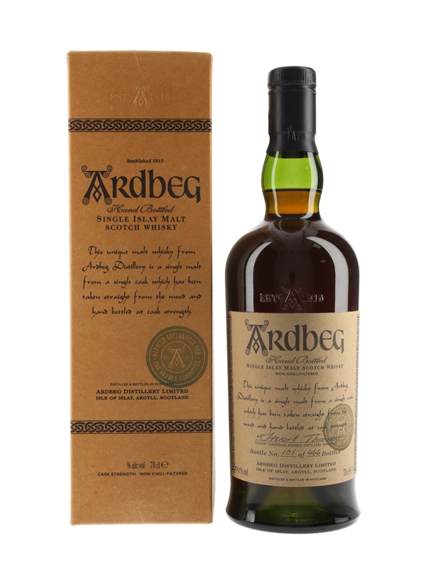 A bottle of Ardbeg 1976 Single Islay Malt Scotch Whisky. This was distilled on 24 November 1976, matured in a single sherry butt and bottled on 18 July 2000 exclusively for the Ardbeg Committee.