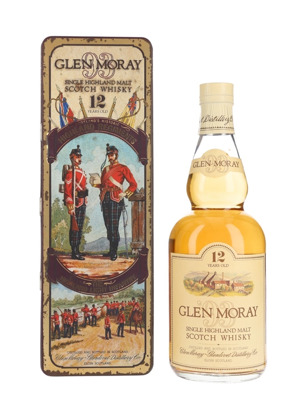 A bottle of Glen Moray 12 Year Old Single Highland Malt Scotch Whisky in a Scotland's Historic Highland Regiments tin. This tin depicts The Highland Light Infantry. We estimate this was bottled in the 1980s.