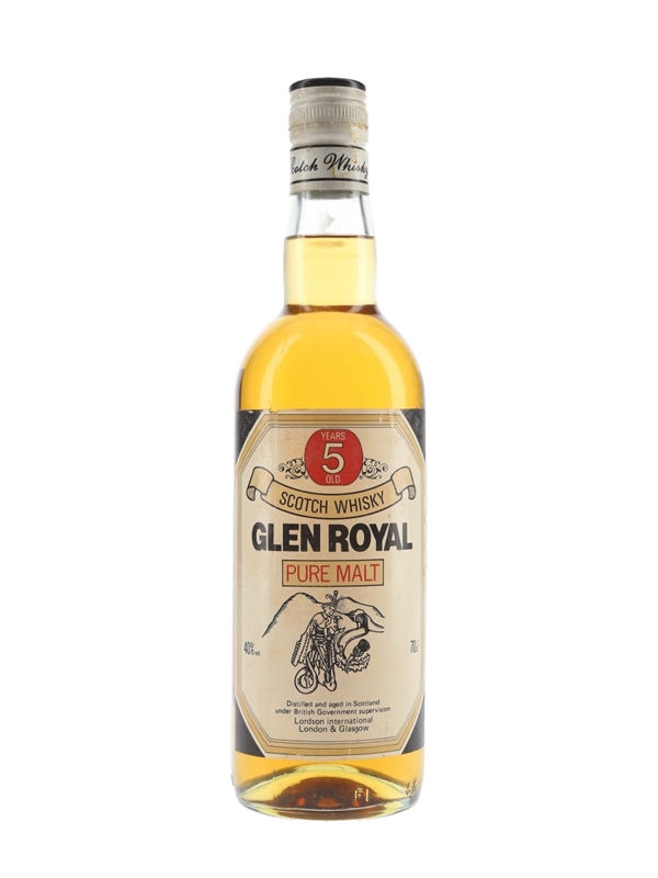 A bottle of Glen Royal 5 Year Old Pure Malt Scotch Whisky. This was produced by Burn Stewart & Co., bottled by Kirrwiller and imported to Italy by Distillerie Sari, we estimate in the 1990s.