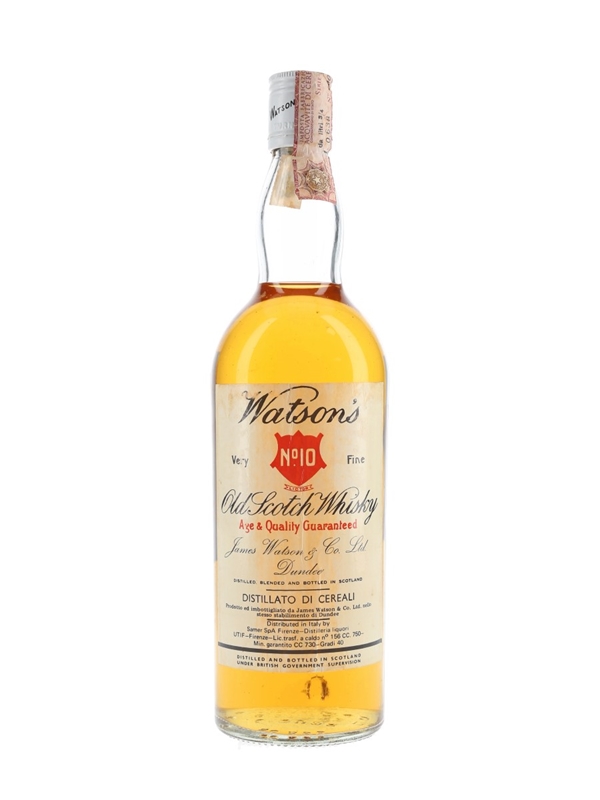 A bottle of Watson's No.10 Old Scotch whisky, produced by James Watson & Co. Ltd. This was bottled for the Italian market and imported by Samer, we estimate in the 1970s.