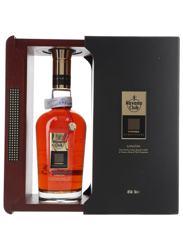 A bottle of Havana Club Unión rum from Cuba. This is a collaborative bottling created by Havana Club’s Maestro Roñero Asbel Morales and Cohiba Master Sommelier Fernando Fernandez Milian, and is designed to accompany Cohiba cigars.