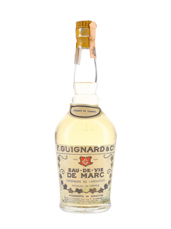 A bottle of Guignard Eau-de-Vie de Marc produced by F Guignard & C in the Languedoc, France. This was bottled for the Italian market and imported by IBE, we estimate in the 1960s to 1970s.