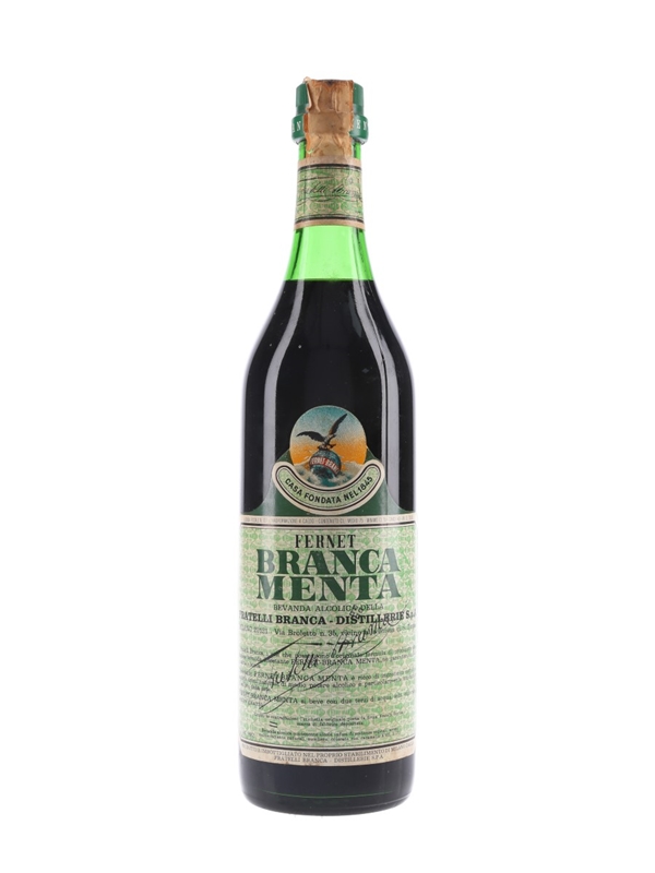A bottle of Fernet Branca Menta, a mint liqueur produced by Fratelli Branca. The label indicates this was bottled in 1974.