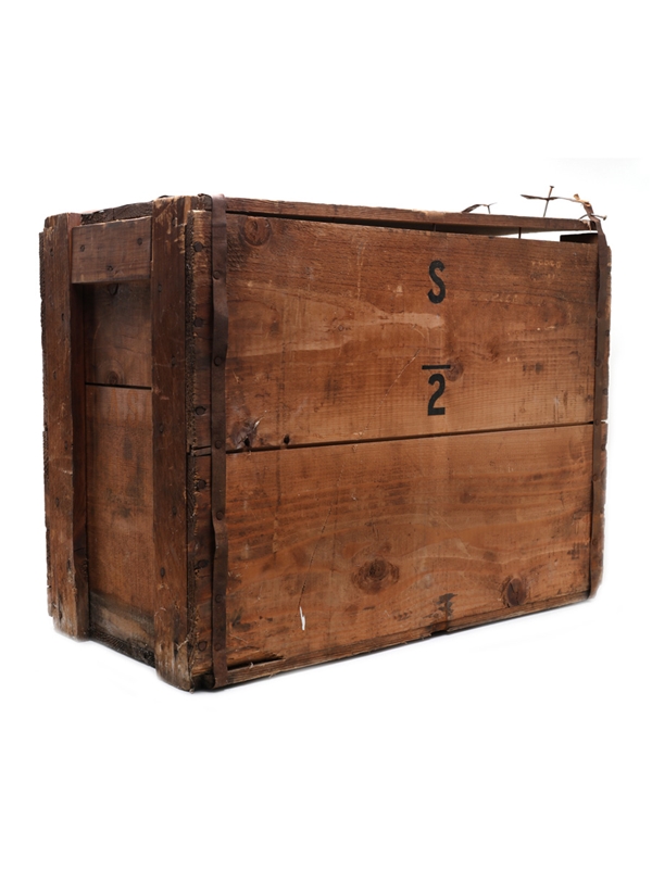 Please see images for fill level and label condition. Note wear to the wooden crate. The crate arrived sealed and was partially opened by us to inspect the contents.