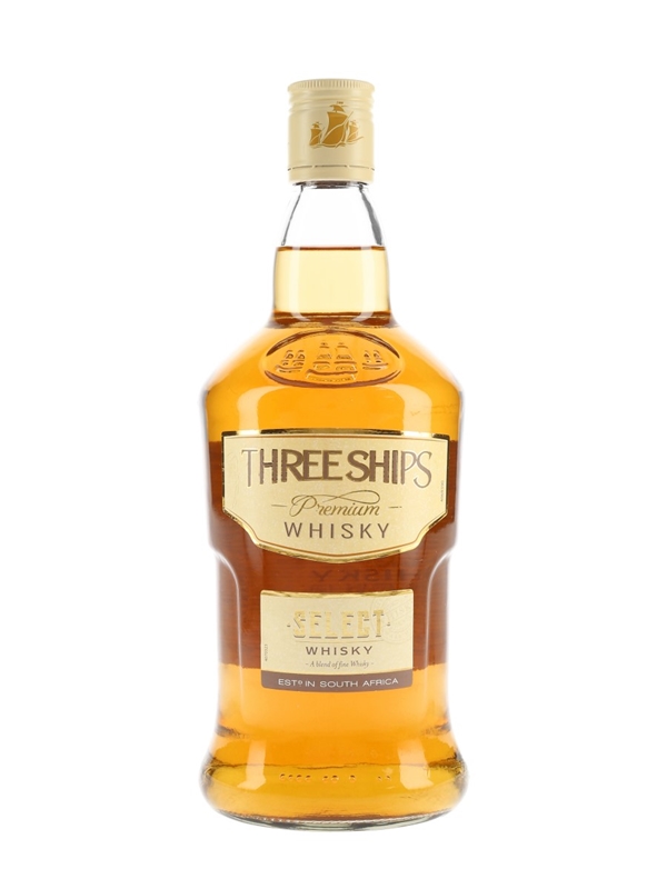 A bottle of Three Ships Premium Select Whisky, a blend of South African and Scottish whisky. This was produced in South Africa at The Sedgwick Distillery.