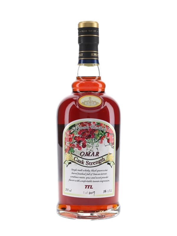 A bottle of Omar Cask Strength Single Malt Whisky, produced at Nantou Distillery in Taiwan. This spents its final maturation period in a black queen wine cask and bottled on 28 December 2018.