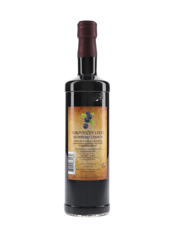 A bottle of Vis Vitalis Borovnices Blueberry Liqueur, made in Slovenia from natural blueberry juice and agricultural alcohol.