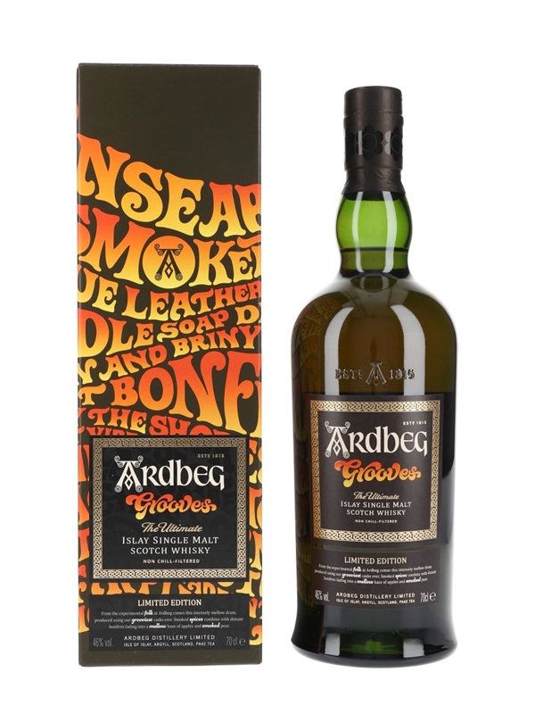 A bottle of Ardbeg Grooves Islay Single Malt Scotch Whisky, bottled to celebrate the Ardbeg Day in 2018.