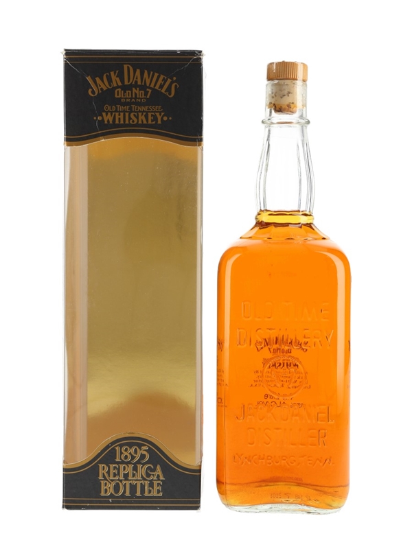 A litre bottle of Jack Daniel's No.7 Old Time Tennessee Whiskey, the 1895 Replica bottle. In the beginning, Jack Daniel's was sold in kegs, barrels, and stoneware jars. The familiar square bottle was first used in 1895.