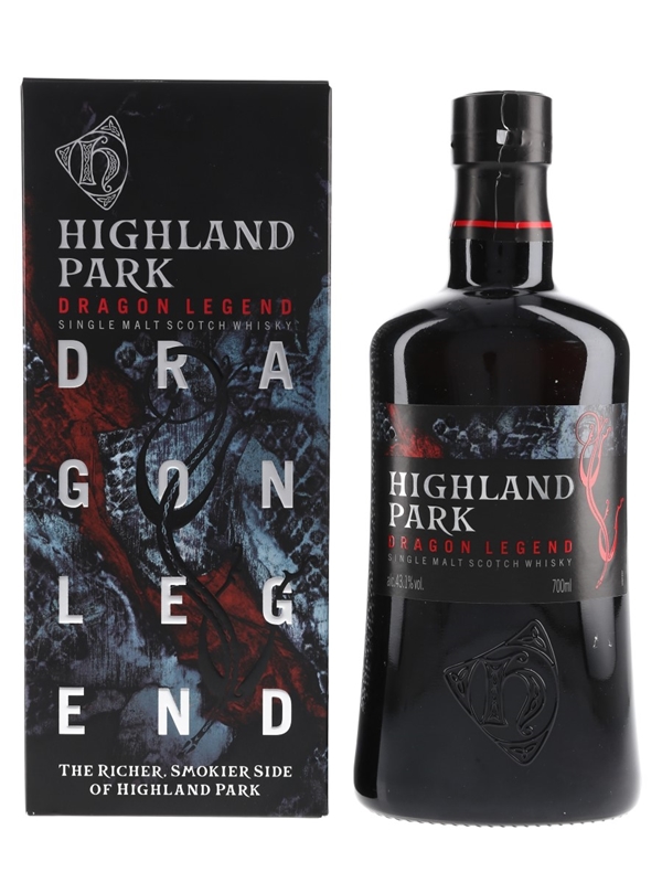 A bottle of Highland Park Dragon Legend Single Malt Scotch Whisky, a richer and smokier expression than the distillery's 10 and 12 year old. This is made from a higher percentage of peated malt stock and matured in European and American sherry-seasoned oak casks.