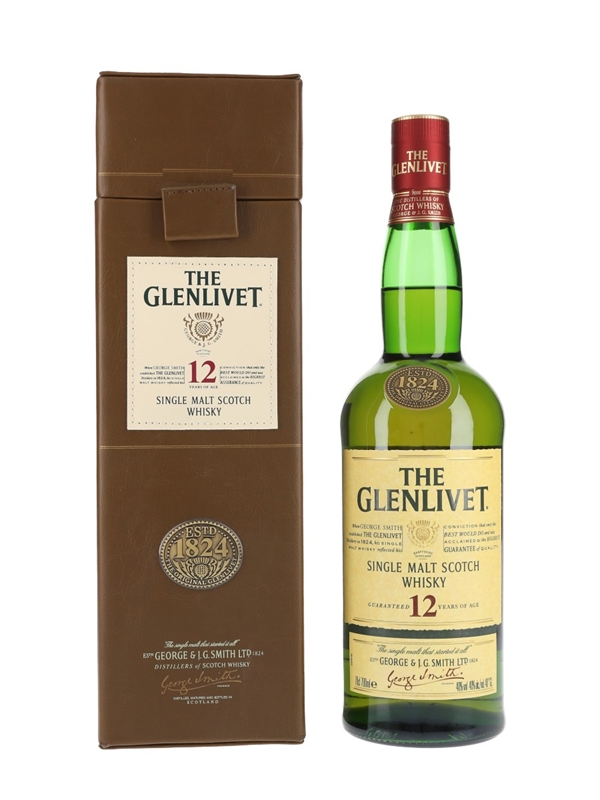 A bottle of The Glenlivet 12 Year Old Single Malt Scotch Whisky in a presentation box. The bottle code indicates that this was bottled in 2007.