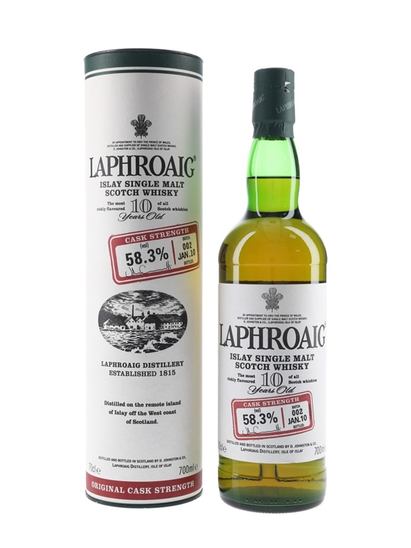 A bottle of Laphroaig 10 Year Old Cask Strength Islay Single Malt Scotch Whisky, bottled at 58.3% ABV in January 2010.