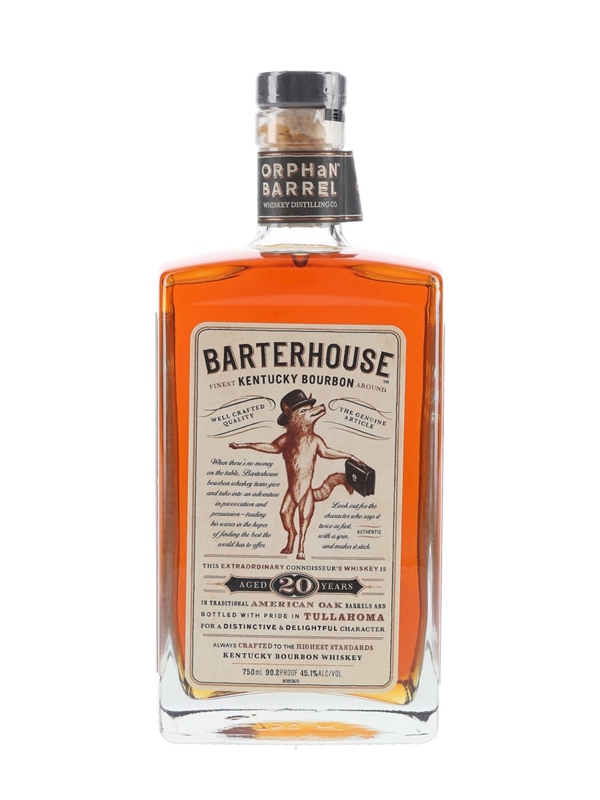 A bottle of Orphan Barrel Barterhouse 20 Year Old Kentucky Bourbon Whiskey, matured in charred American white oak barrels and bottled at 45.1% ABV. This was bottled by Orphan Barrel Whiskey Distilling Co. in Tullahoma, Tennessee.