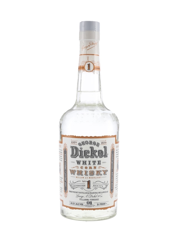 A bottle of George Dickel No.1 White Corn whisky, an unaged spirit based on the distillery's Foundation Recipe. This was distilled and charcoal mellowed at George A Dickel & Co. Tullahoma, Tennessee.