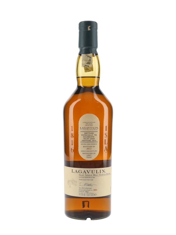 A limited edition bottle of Lagavulin 1997 Islay Single Malt Scotch Whisky. This was distilled in 1997, matured in a refill sherry butt and bottled at natural cask strength to celebrate the Islay Jazz Festival 2012.