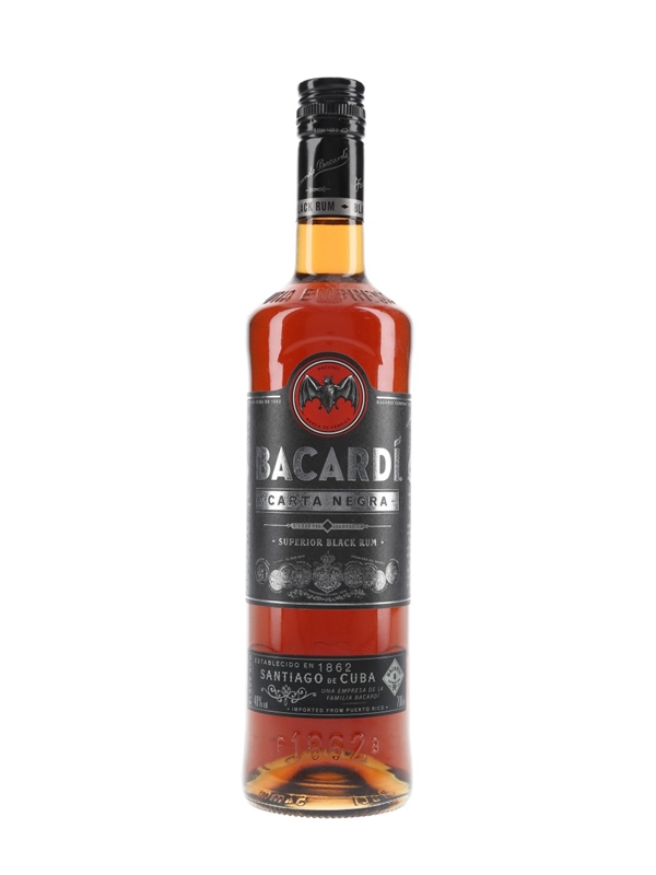 A bottle of Bacardi Carta Negra superior black Rum. This was produced in Puerto Rico and imported and distributed in the UK by Bacardi-Martini Ltd.