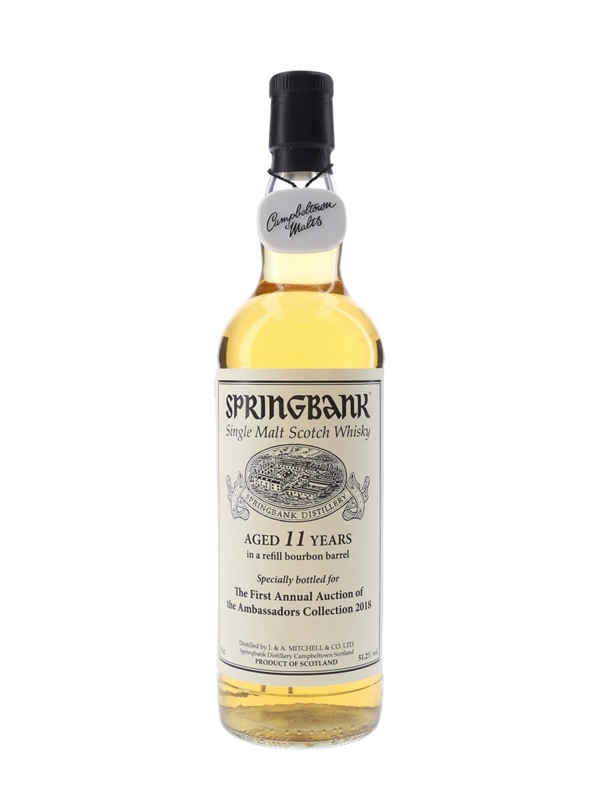 A bottle of Springbank 11 Year Old Single Malt Scotch Whisky. This was matured in a refill bourbon barrel and bottled at cask strength for The First Annual Auction of the Ambassadors Collection 2018. This was bottled on 01 November 2017.