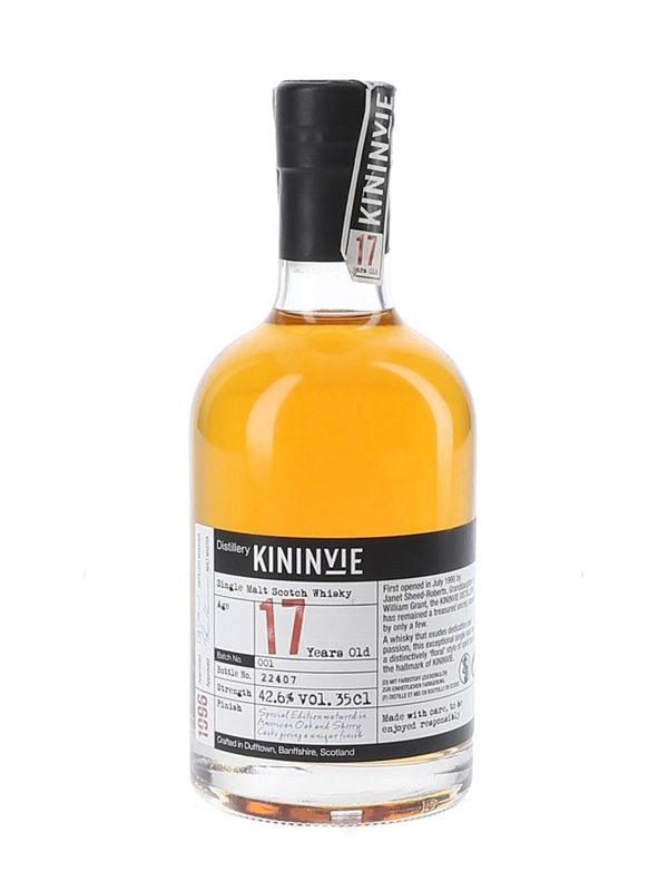A 35cl bottle of Kininvie 17 Year Old Single Malt Scotch Whisky. This was distilled in 1996, matured in American oak and sherry casks and bottled as a travel retail exclusive.