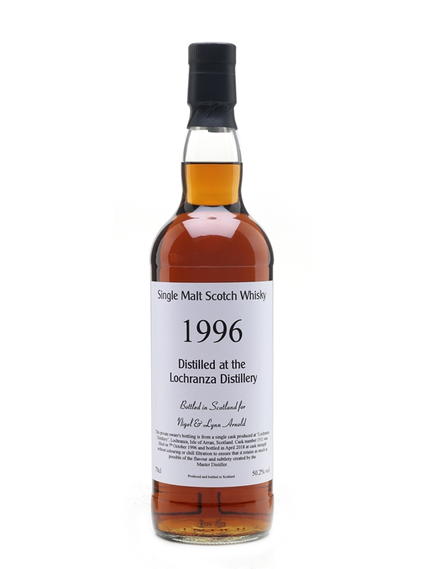 A private cask bottling of 1996 vintage single malt whisky produced at Lochranza distillery, Isle of Arran. This was distilled on 7 October 1996, matured in a single cask for more than 21 years, and bottled in April 2018 at natural cask strength.