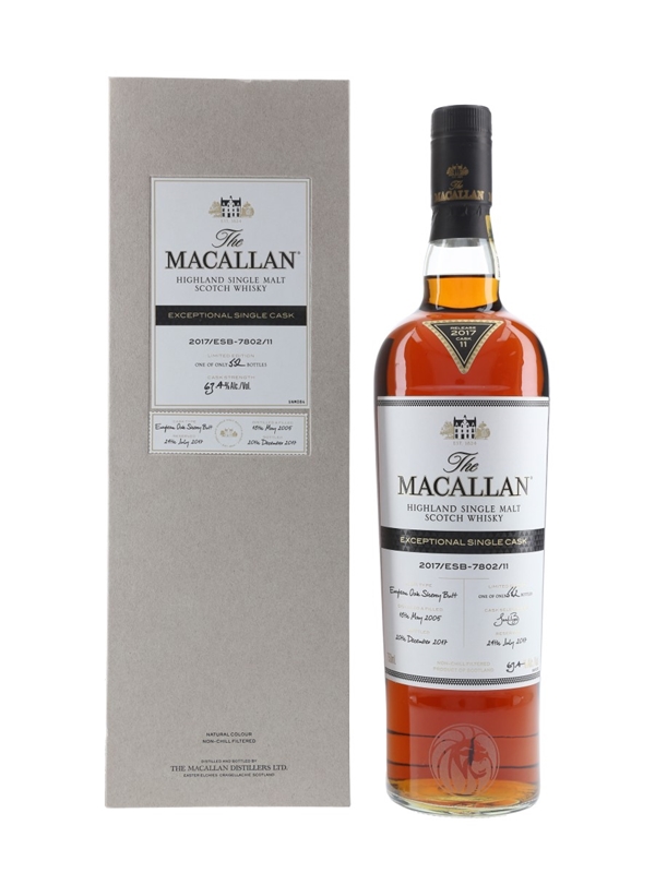 A bottle of The Macallan Highland Single Malt Scotch Whisky from the Exceptional Single Cask series. This was distilled on 18 May 2005, matured in a European oak sherry butt and bottled on 20 December 2017.