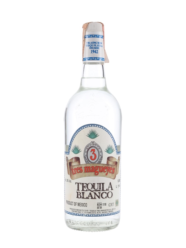 A litre bottle of Tres Magueyes Tequila Blanco from Mexico. We estimate this was bottled in the 1980s.