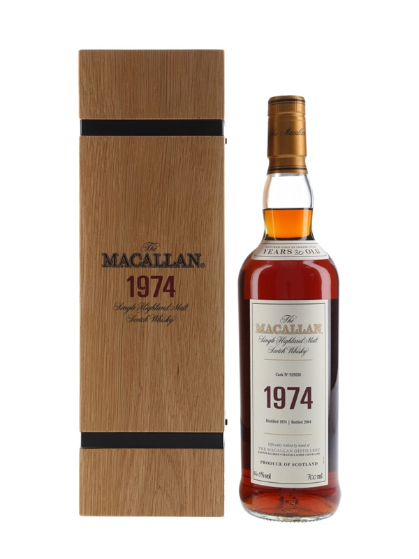 A bottle of The Macallan 1974 Single Highland Malt Scotch Whisky from the Fine & Rare collection. This was matured in sherry wood for 30 years and bottled in 2004.
