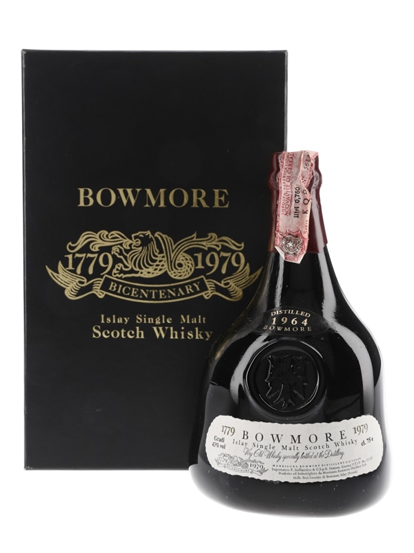 A bottle of Bowmore 1964 Islay Single Malt Scotch Whisky, matured in sherry casks and bottled in 1979 to celebrate the distillery's Bicentenary. This is packaged in a hand blown decanter with presentation box and stopper, and comes with a certificate of authenticity. This was bottled for the Italian market and imported by Soffiantino.