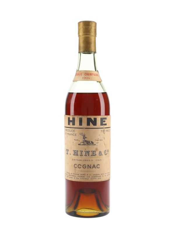 A bottle of Hine 1904 Grande Champagne Cognac, bottled and shipped by Thomas Hine & Co. We estimate this was bottled in the 1960s.