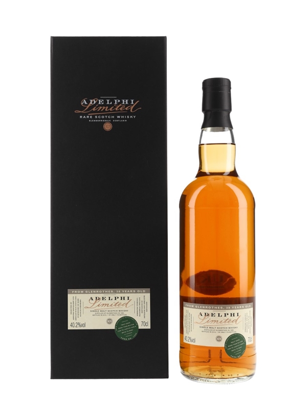 A bottle of Glenrothes 38 Year Old Single Malt Scotch Whisky. This was distilled in 1980, matured in a single cask and bottled at cask strength in 2019 by Adelphi Distillery Ltd.